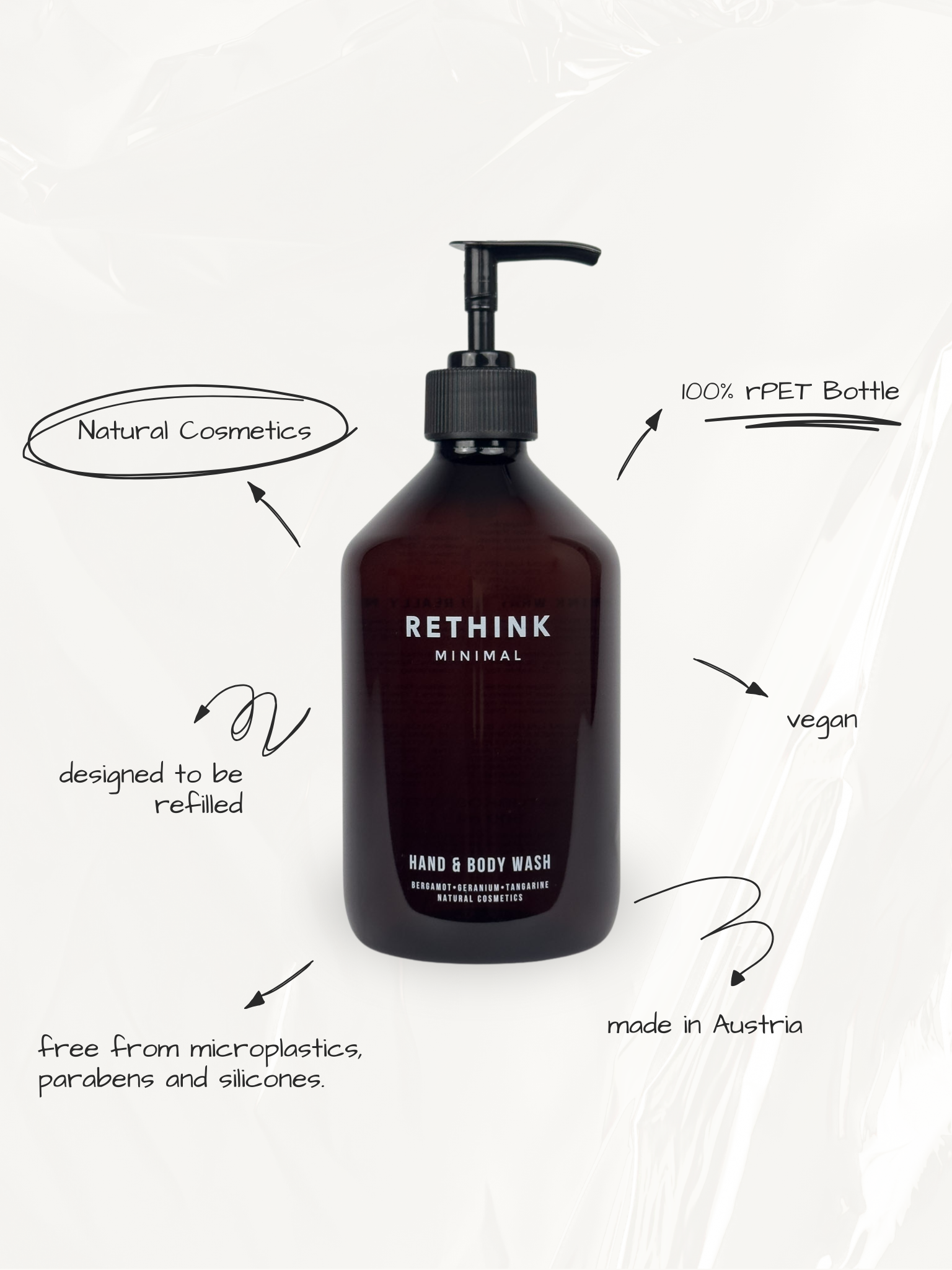 Die Flasche wurde aus 100% recyceltem Plastik (rPET) hergestellt. Wir haben uns für dieses Material entschieden, da es besonders langlebig und bruchsicher ist und somit auch problemlos in der Dusche oder in einem Haushalt mit kleinen Kindern verwendet werden kann. Darüber hinaus war es uns wichtig, dem Plastik, welches bereits im Umlauf ist ein zweites Leben zu geben, damit es nicht nach einer Anwendung entsorgt wird.
